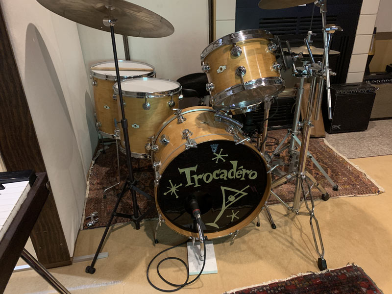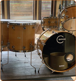 The Camco Drum Company made drums from the late sixties (Oaklawn) until 1977 (Los Angeles) when the company was parted to Tama and Drum Workshop. Camco drums were different from other brands, and from themselves in each era, and while it's beyond the purview of these notes to go in detail, Camco drums are distinctive enough to merit their own entry. The later, Los Angeles-made Camco drums have the particularity of sounding particularly "tympanic." Using angled, horizontally mounted bass drums and striking 100% animal skin using bachi, they've been useful not only as general percussion, but also as supplements to Taiko sample libraries. Our Oaklawn and LA kits were restored thanks to the help of two professionals: Bob Saull provided guidance and located the rare missing hardware, and Chris Mattoon brought the orphan shells back to factory specs. Nico
