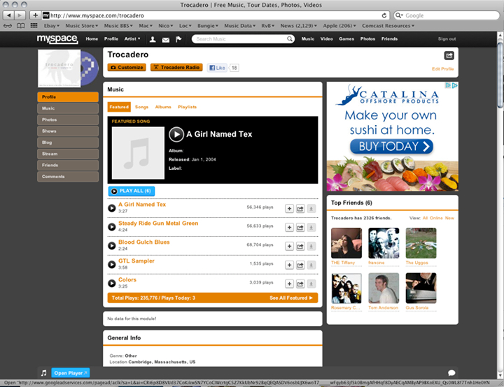 There's apparently a "new" MySpace, so I'm trying to update our very outdated band page there, but I keep getting distracted by all the ads. (Yes, I would like to cook sushi at home.) We didn't call it My Ad Space dot com for nothing, I guess