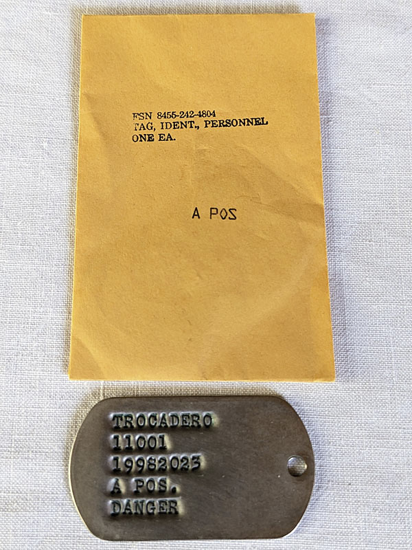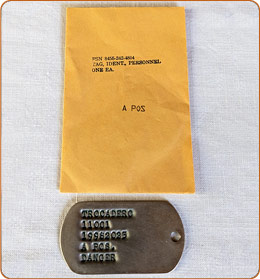 We found a small batch of blank ("new old stock") 1964 Vietnam-era ID tags, FSN 8455-242-4804. 1964 was the first year the notch was removed. They're made of monel, unlike stainless steel replicas. There's nothing wrong with modern ones, and we highly recommend the fine folks at